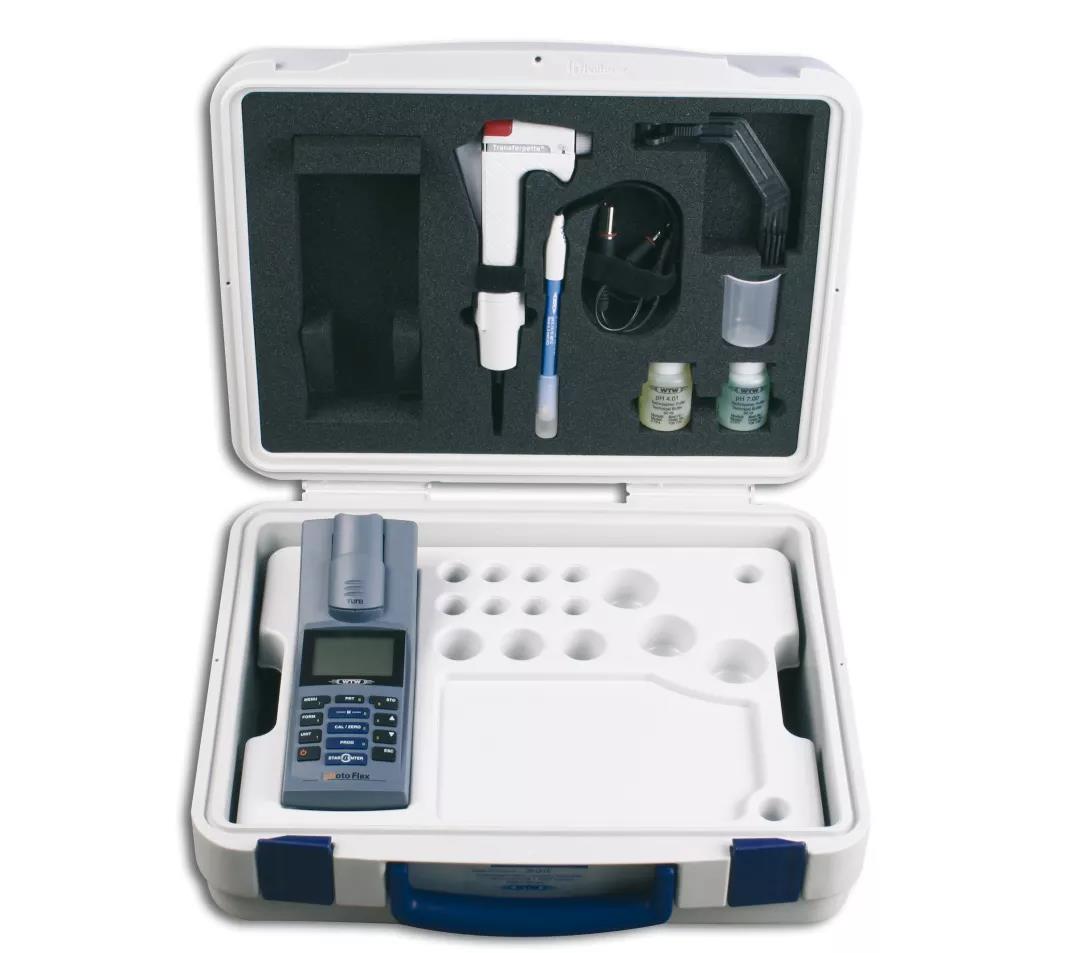 便携式光度计photoFlex系列,采用电池供电,小巧坚固,可以用于各类户外现场取样进行快速比色分析。测试参数可达40个,内置曲线110多条。配套使用余氯分析预装试剂,操作简便,1-2分钟即可得到样品浓度。仪器同时具备测量数据存储功能,为现场数据记录提供了方便。根据需要,可以配备便携箱,箱内分门别类包含了所有现场使用的各种工具,满足分析需求。